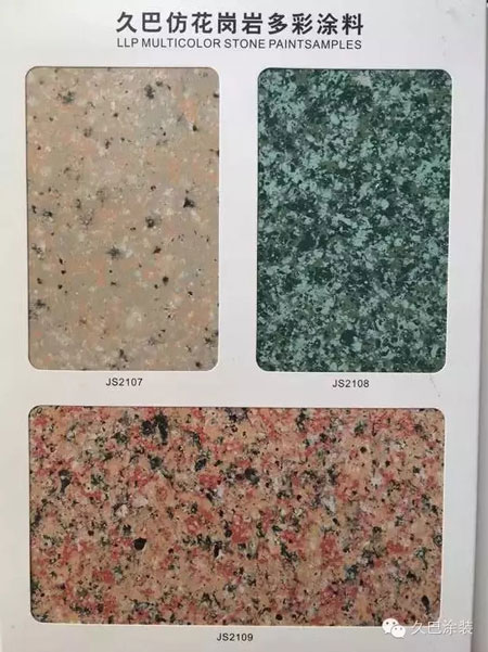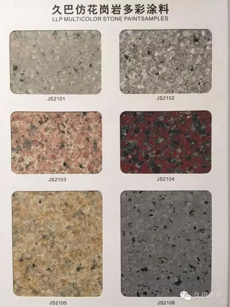 久巴仿花岗岩多彩漆:突破传统配方,经过数百次配方改良,把水包水漆产品改进,既提升了产品的防石逼真度又可达到集真石漆绝佳透气性、抗开裂、仿石质感强烈等优点于一身,使用寿命长达10年。