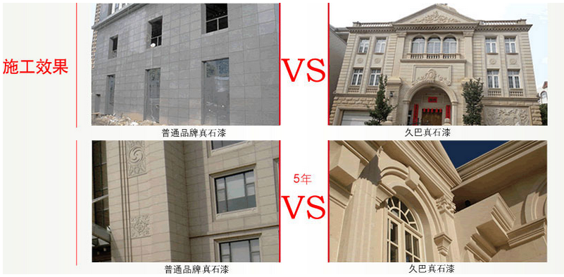 久巴荷净真石漆主材采用天然彩砂和进口乳液,树脂含量达到14%以上(市场上大部分真石漆的树脂含量为8%左右),耐候性、耐久性、保色性好。