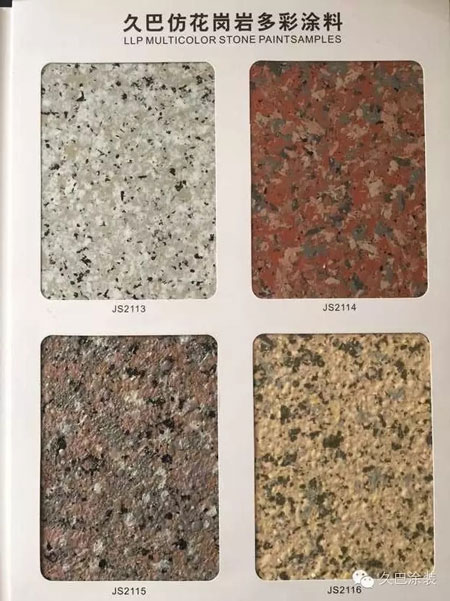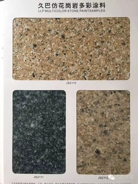 久巴仿花岗岩多彩漆:突破传统配方,经过数百次配方改良,把水包水漆产品改进,既提升了产品的防石逼真度又可达到集真石漆绝佳透气性、抗开裂、仿石质感强烈等优点于一身,使用寿命长达10年。