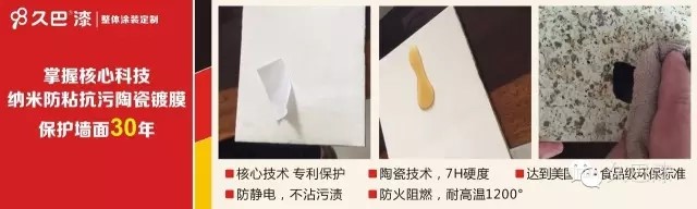 久巴掌握核心科技,行业第一家研发上市并获得专利保护的纳米防粘抗污陶瓷镀膜,硬度达到7H,超过水性木器漆的7倍,防粘抗污,连牛皮藓广告都无处可贴,防火阻燃更安全,产品达到美国FDA食品级环保标准。久巴承诺使用纳米防粘抗污陶瓷镀膜,保护墙面30年。