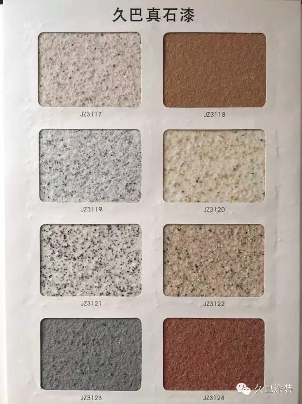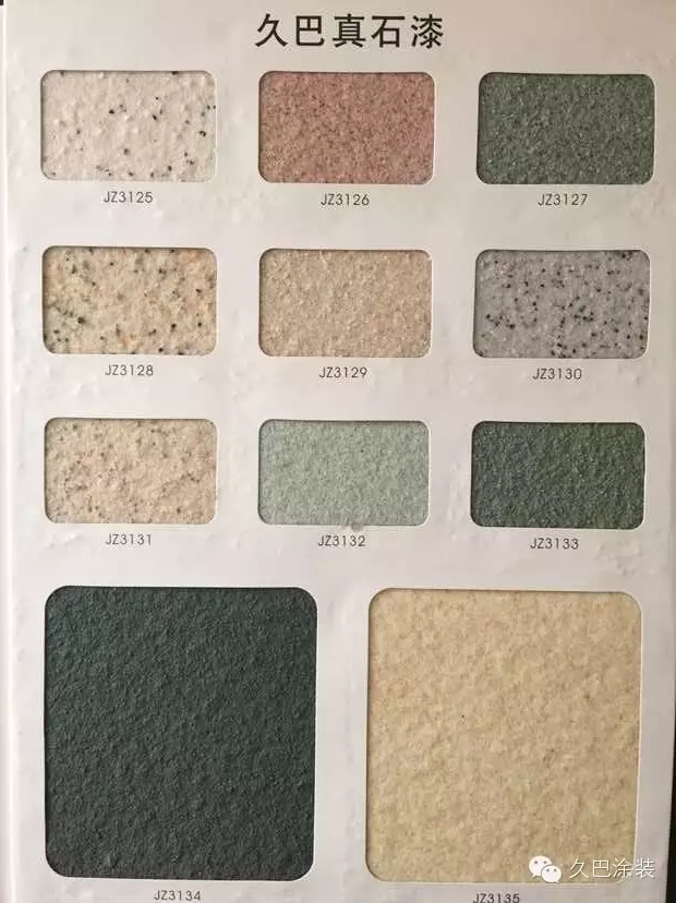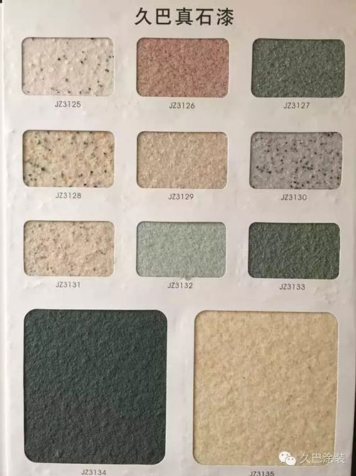 久巴天然真石漆:采用天然彩砂,进口乳液,加以精湛工艺而成。久巴真石漆平均树脂含量都能达到12%以上,弹性乳胶漆树脂含量更高,因而产品有更好的附着力,保色性和耐久性。久巴真石漆产品主要分为三个档次:苯丙类、纯丙类、硅丙类(产品档次由低到高顺延)。