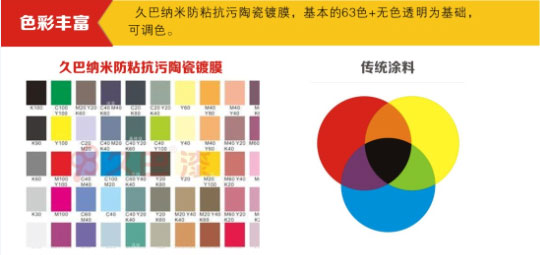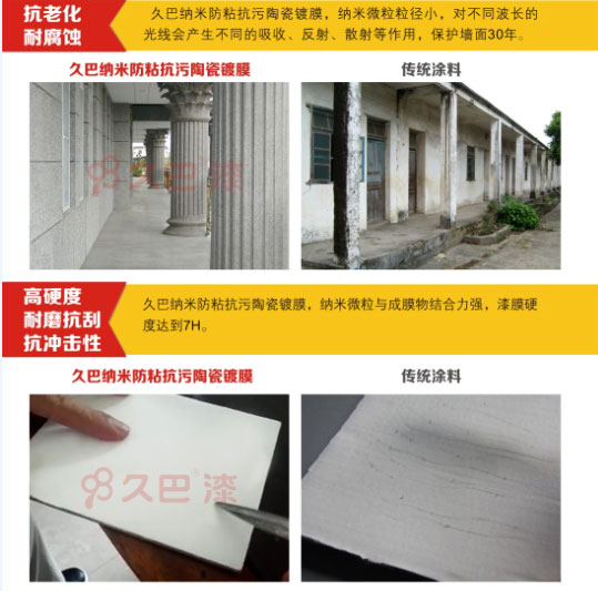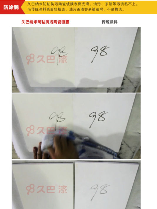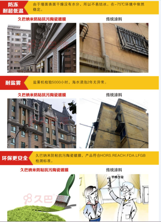 首先我们要了解什么是久巴纳米防粘抗污陶瓷镀膜。久巴纳米防粘抗污陶瓷镀膜涂料,采用纳米无机化合物为主要基料,通过改进的溶胶-凝胶反应,水解固化等多重反应而形成致密的纯天然水性纳米环保涂膜。纳米无机涂层结构表面张力很大(指数高达120+σ),涂膜完全固化状态不易挥发、不易与其它物质相互作用,所以99%的生活污物及胶状物不能附着涂层表面,更加不受阳光和外线的影响,不产生霉菌变质,不怕酸碱性雨水侵蚀,可对建筑物涂层提供30年长久的的保护性能。