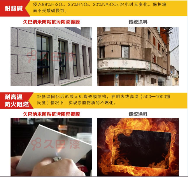 久巴纳米防粘抗污陶瓷镀膜涂料严格按照德系的外墙涂装标准工艺施工,基层处理的底子做得好,墙面保护时间更长久,17道工艺标准,施工监理层层验收,真材实料,坚守工艺标准,涂层使用可达30年以上。