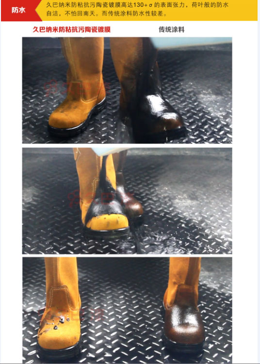 久巴纳米防粘抗污陶瓷镀膜有着极好的不粘、疏水、疏油、耐磨、抗老化、耐高温、耐腐蚀、耐各种酸碱化学品特质,同时纳米性又决定了产品纯天然环保、抗菌防霉不受环境影响的良好功能。