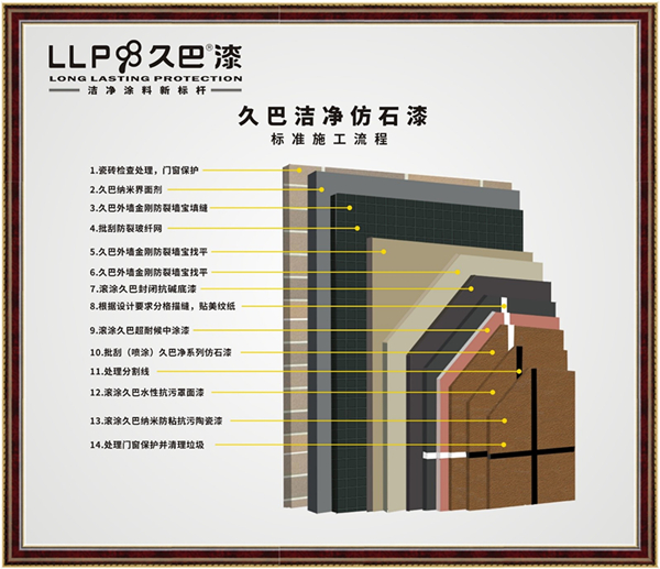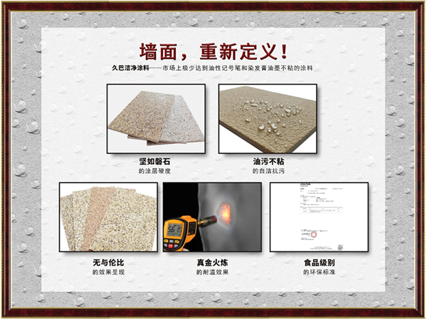 多年以来,久巴始终坚持“顶级科技,创造奇迹”的宗旨,从未停下过科研的步伐,最终在仿石漆市场低迷的时候实现逆风飞翔,推出的“净”系列仿石漆产品备受业主推崇,颠覆传统仿石漆效果,装饰效果突出,功能强大,具备超强自洁力,能够抗击污渍、不怕涂鸦,改变了传统仿石漆在面对水渍、污迹时候的劣势,处于行业的领先高科技产品,在提供具有竞争力产品的同时,通过合理化的设计、科学的施工方案,确保外墙效果保持更长久,给仿石漆行业开创了新的局面!