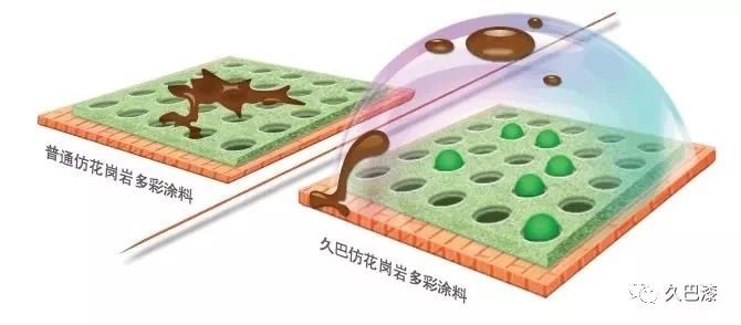 疏水,即不沾水。水一直是墙面的天敌,水的力量绵长、坚韧,有一个词叫做水滴石穿,如果不能完全防水,那墙面就会慢慢腐朽、起鼓、空壳、脱落。久巴“净”系列仿石漆的漆膜完全固化后,形成一层致密的墙体保护膜,使得表面张力达到指数高达130+σ,涂膜完全固化状态不易挥发、不易与其它物质相互作用,所以99%的生活污物及胶状物不能附着涂层表面,遇水如荷叶般、如鸭毛般滴落,防水防油,拥有超高的自洁性,不怕回南天、不怕雨水。
