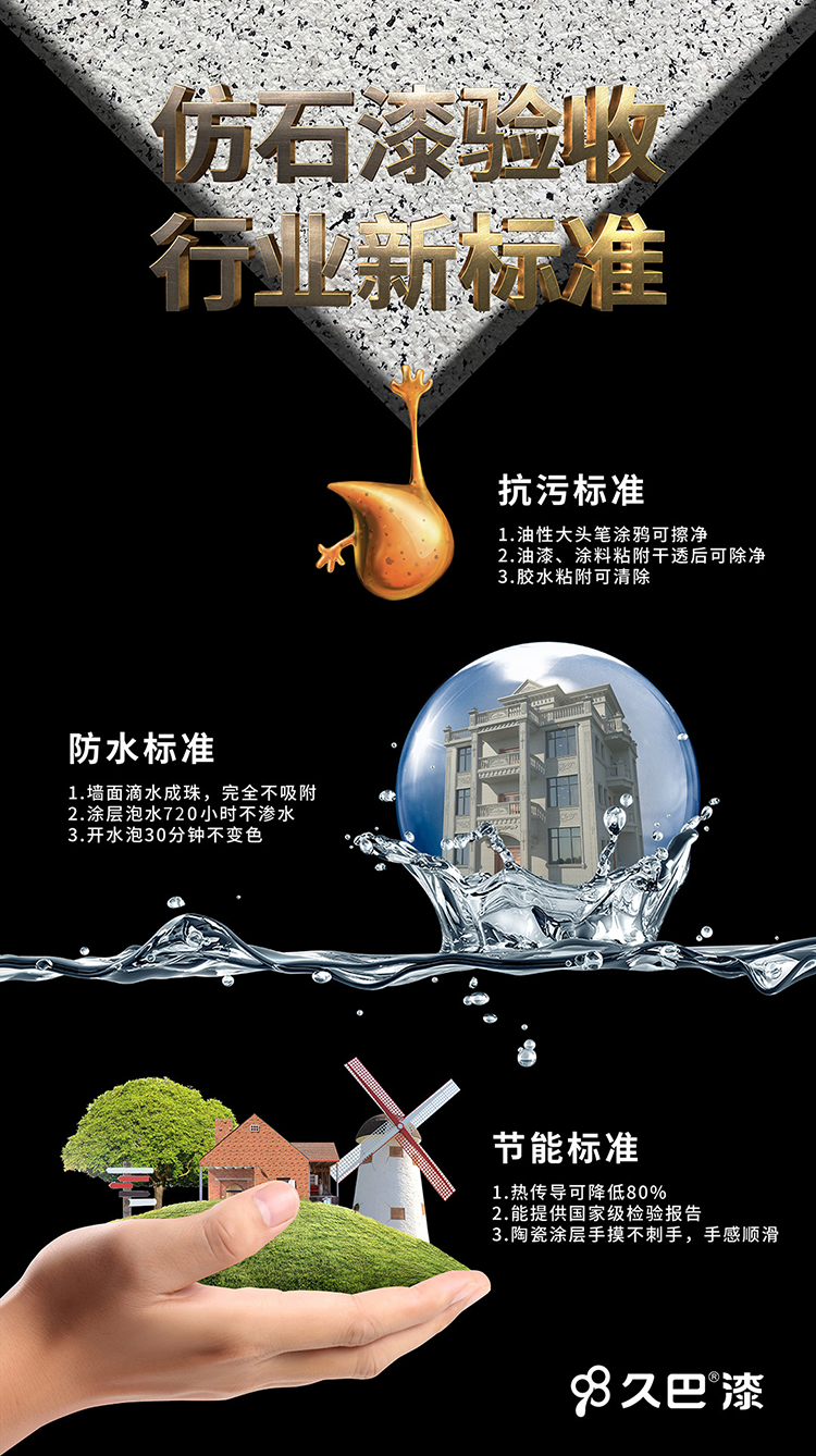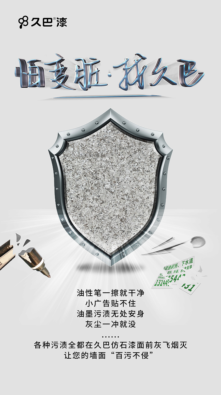 久巴是一家专业研发制造高端仿石漆的国家高新技术企业,主要研发、生产、制造高端仿石漆,是第一个采用金属陶瓷产品来制作的外墙涂料的涂料企业,同时也是国内最大的金属陶瓷涂料的生产制造商,生产高端工业不粘涂料,主要客户有美的电器,苏泊尔,格力等等家电企业,大多数的不粘锅和电饭煲涂层都是采用久巴的金属陶瓷不粘涂层。从2015年开始,创新性的将金属陶瓷不粘涂层应用于内外墙,和传统丙烯酸类型涂料最大的区别是,涂层抗老化提升10倍以上,涂层不粘任何污渍,油性记号笔涂鸦后一擦就干净。涂层超级防水,泡水两个月时间,涂层还是不渗水,所以解决了传统涂料容易变脏,发黑,起皮,褪色的问题。