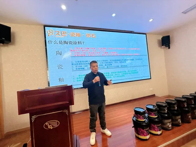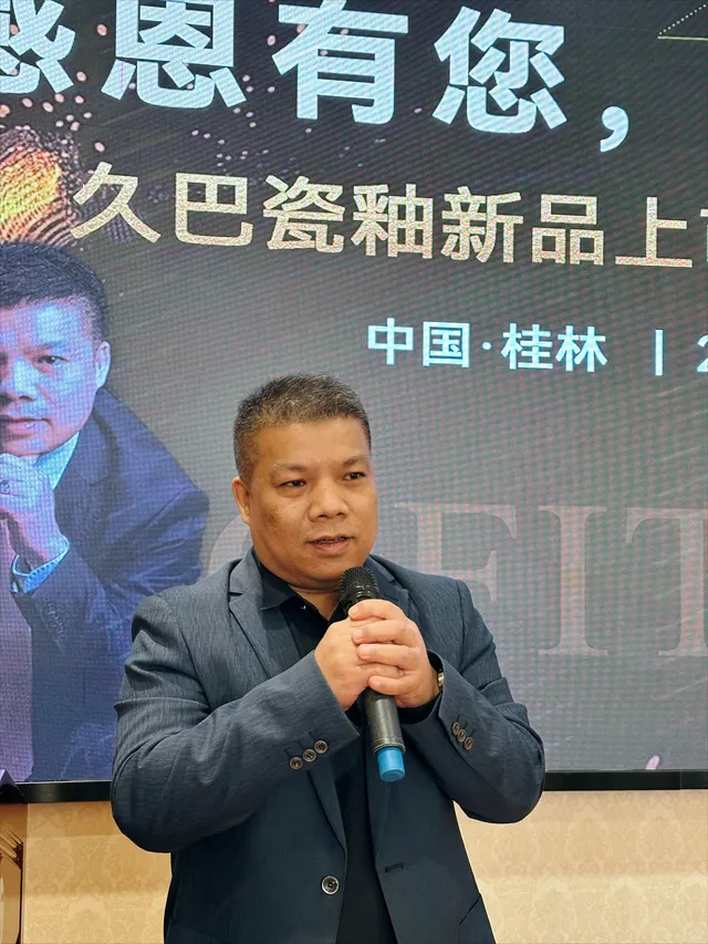 会议由久巴广西分公司总经理黄浪生主持,广东久巴新材料科技有限公司总裁张文辉对久巴瓷釉新品作了详尽的介绍。
