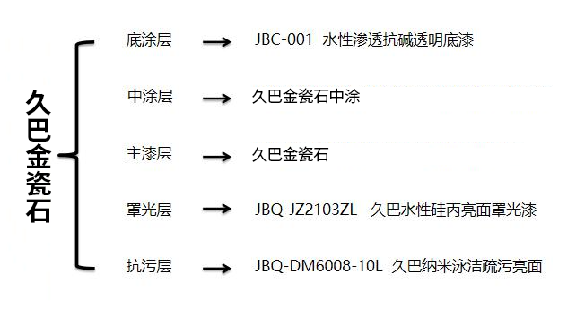 | 中涂层 | JBQ-JZ3137Z 久巴金瓷石仿石漆中涂 | 20KG | 约5-6㎡/kg | 油漆刷、滚筒、喷枪 |